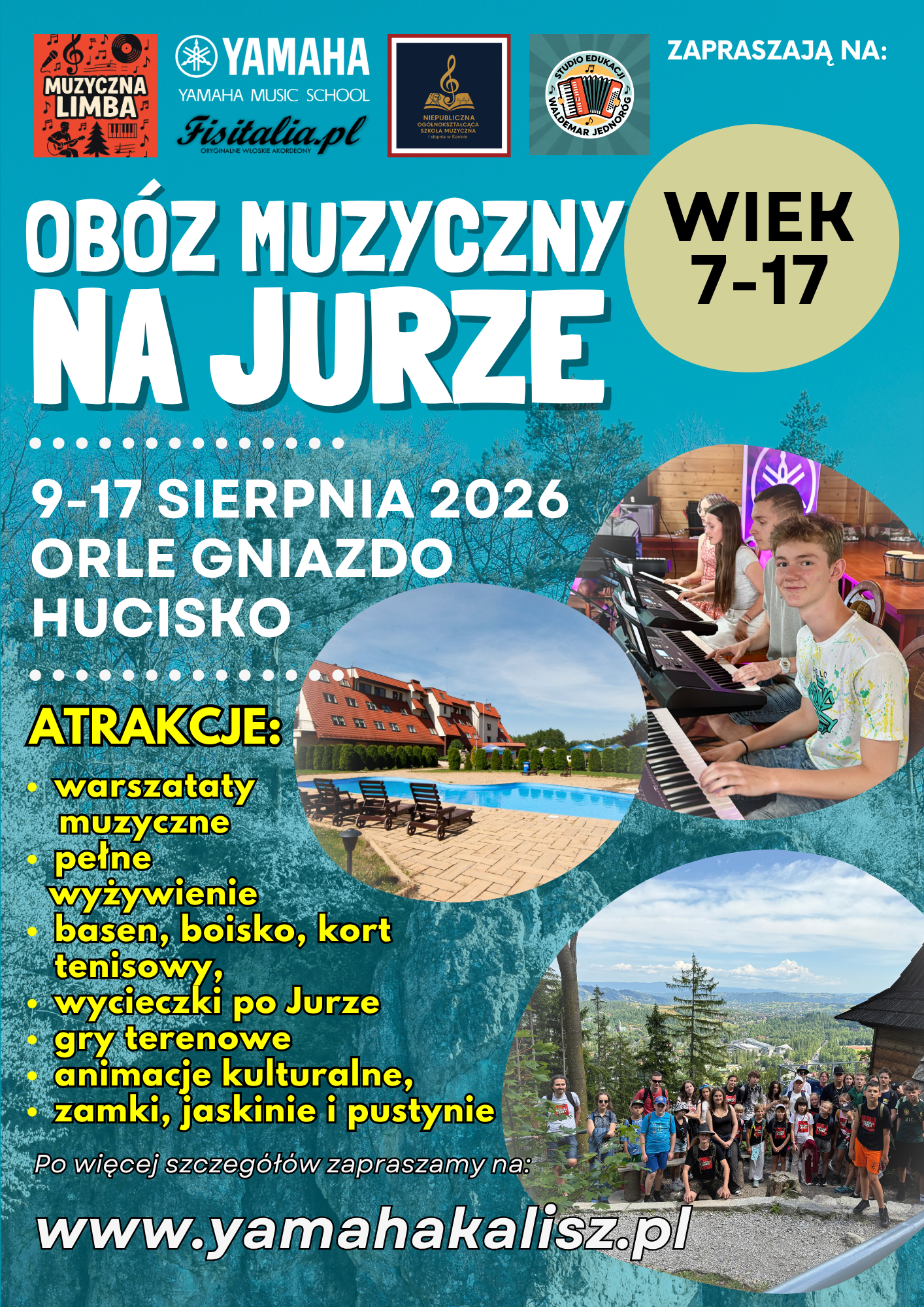 Serdecznie zapraszamy do udziału w czternastej edycji Obozu Muzycznego organizowanego przez Szkołę Muzyczną YAMAHA w Kaliszu i Koninie. Udajemy się do ośrodka Orle Gniazd w Hucisku koło Kroczyc na Jurze Krakowsko - Częstochowskiej gdzie mamy znakomite warunki do bezpiecznego i komfortowego wypoczynku !